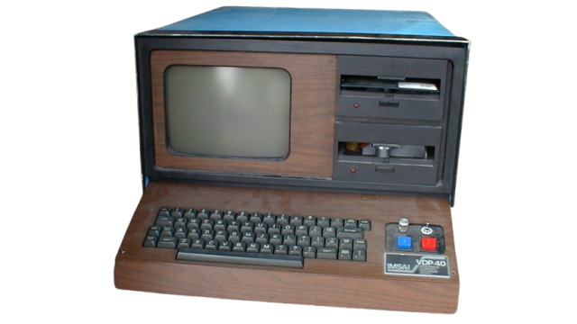 This evolution of the IMSAI 8080 had two 80/160KiB floppy disk drives built in, retained the S-100 bus, and had a built-in CRT monitor.