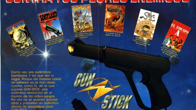 A gun that works with a photosensor, which, through a lens, allows you to know whether you are aiming at a lit or dark area of the screen and transmits this information through the joystick port.
